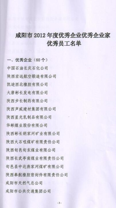 總公司榮獲2012年度咸陽市優(yōu)秀企業(yè)